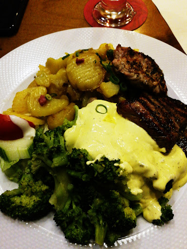 Read moreLeider echt enttäuschend. Wir waren heute Abend da. Das Restaurant war sehr voll aber uns wurde auch von anfang an gesagt, dass es etwas dauert . War für uns auch kein Problem. Das Essen hat uns leider sehr enttäuscht. Der Service wirkte sehr überfordert. Die Kartoffelcreme zum Brot war Fertigsauce, wie es sie im Laden zu kaufen gibt. Ich hatte ein Jägerschnitzel bestellt , die Kellnerin sagte mir als das Essen kam : "Ihr Schnitzel mit Pfeffersauce " , ich habe gesagt das ist falsch . "Ach ja ist die Jägersauce"...war aber trotzdem die Pfeffersauce, im Dunkeln (saßen draußen und war schon dunkel) konnte ich das nicht sehen. Habe das Essen zurück gehen lassen , da die Sauce ungenießbar war. Ich bekam dann ein neues, allerdings erst als die anderen am Tisch schon fast fertig waren . Aber auch die Jägersauce war ungenießbar und schmeckte sehr nach Tütensoße. Das Schnitzel war ohne Sauce viel zu trocken. Die Bratkartoffeln waren ziemlich matschig und das einzige geschmackvolle daran waren die vielen Lauchzwiebeln. Das Steak welches Englisch gegart sein sollte war Medium und das Fleisch von der Steakpfanne war zäh und durch. Soßen wurden vom Service vergessen . Mussten mehrfach erinnern. Es wurde nicht einmal gefragt ob alles gut ist oder wie es geschmeckt hat. Wir sind sehr enttäuscht und kommen nicht wieder . Preise für die Qualität nicht...