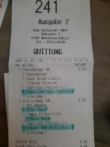 Read moreWaren heute da,weil mein Sohn unbedingt das neue Mozzarella Wrap probieren wollte. Wir haben unterwegs schon die Bestellung fertig gemacht und mit Nummer am Tisch auf unsere Bestellung gewartet. Es war voll, daher haben wir eine halbe Stunde gewartet und dann wollte ich nachfragen. Es verstand mich aber kaum jemand und es hieß ich solle weiter warten. Dann hieß es Systemfehler unsere Bestellung wurde verschluckt. Kein Problem. Essen war dann schnell da aber falsche Sauce, ein Burger fehlte, Pommes matschig. Mein Mann versucht zu reklamieren, mein Sohn beißt im sein Wrap, guckt komisch und stellt fest er hat in Hähnchen gebissen. Da er schon Jahre vegetarisch isst, natürlich nicht so gut. Zweiter Wrap auch mit Fleisch. Ich wieder versucht zu reklamieren. Es ist über eine Stunde vergangen. Dann irgendwann jemand der mich versteht und 2 Wraps macht, noch bevor ich was sagen kann dass es Sonderwünsche gibt wie ohne Sauce etc. für das 2. Wrap ist die Person verschwunden. Ich bekomme nach langer Wartezeit 2 Mozzarella Wraps mit Sauce , die man ja nicht runter machen kann und nach all der Wartezeit, der schlechten Erfahrung mit dem Chicken Wrap und den 36€ die wir insgesamt ausgegeben haben wollte ich unbedingt das was wir bestellt hatten. Ich also wieder reklamiert. Die Mitarbeiterin sagte dann sie hätte jetzt Feierabend soll sich jemand anderes drum kümmern. Wieder versucht jemanden zu erwischen und das zu bekommen, was ich vor einer Ewigkeit bestellt hatte. Irgendwann habe ich es geschafft. Ich habe wirklich viel Verständnis für sämtliche Fehler und auch Wartezeit aber das heute war eine absolute Katastrophe. Die Pommes waren nicht genießbar aber das war noch das...