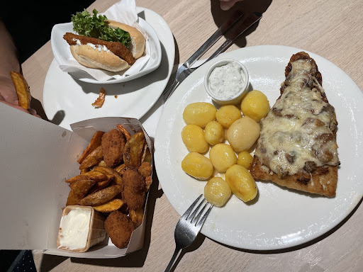 Read moreLeckere Fischspezialitäten und regelmäßig wechselnde Gerichte. Mittags ist fast alles immer frisch, hat also nur kurz in der heißen Auslage gelegen oder kommt frisch aus der Fritteuse oder Pfanne. Abends hingegen sind die Auslagen noch vom Nachmittag befüllt und die Panade beim Fisch ist wie Kaugummi, der Fisch trocken, Bratkartoffeln sind matschig und fettig und Salzkartoffeln haben eine Haut bekommen.