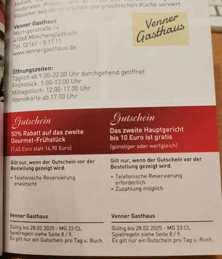 Wir sind sehr enttäuscht worden. Wir haben das Venner Gasthaus über das Mönchengladbacher Gutscheinbuch entdeckt und dort telefonisch reserviert (so wie es im Gutscheinbuch steht - und es steht dort NICHT, dass man am Telefon das Gutscheinbuch erwähnen muss!!!!). Vor Ort teilte uns die Kellnerin mit, dass sie den Gutschein aus dem Buch (ein 2tes Hauptgericht gratis) nicht annehmen darf. Wir waren darüber sehr verwundert, da wir ja extra wegen des Gutscheinbuches gekommen waren. Sie blieb aber freundlich und verwies auf den Besitzer, der dann auch später zu uns kam. Er war leider wenig interessiert und recht wortkarg. Im Dezember meinte er, nimmt er eh keine Gutscheine an (sehr voll war es jetzt nicht im Lokal). Nun, das steht aber nirgends im Gutscheinbuch für sein Restaurante. Dann sagte er, da wir bei der telefonischen Reservierung das Buch nicht angekündigt haben, gilt es nicht. Ok, wir könnten ja nochmal aufstehen, vor die Türe gehen, anrufen und es ankündigen....naja....Unser Bekannter versuchte dann noch einmal im 4AugenGespräch nachzufragen, was wir im Buch übersehen haben, aber der Besitzer war nicht einsichtig und meinte immer wieder, dass seinen die Regeln. Seine erfundene Regel haben wir jedoch nicht gefunden. Schon ärgerlich, aber da wir einmal saßen, es spät war und die Kinder Hunger hatten...ja wir haben dann Essen bestellt, es war auch lecker und die Bedienung war trotzalledem freundlich. Aber wir kommen sicher nicht wieder und werden dieses Gasthaus auch nicht weiter empfehlen. Also aufpassen, wer mit dem Gutscheinbuch dort essen möchte! Der Besitzer nimmt die Gutscheine nicht an. Es stellt sich mir nur die Fragen, warum er dann in dieses Buch wollte. Wir sind ja, wie man bei weiteren Bewertungen weiter unten lesen kann, nicht die einzigen, die dieses Erlebnis hier teilen. Und unverschämt ist es, zu behaupten, dass man sich nicht an die Regeln hält, wenn man selber der Regelbrecher ist. Nirgends wird erwähnt, dass die Gutscheine für dieses Lokal im Dezember nicht gelten und dass man am Telefon auf das Gutscheinbuch...