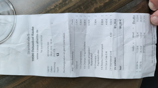 Wir waren vom 28.03.-01.05. Gäste im Casa-Atlantis. Wollten am 30.04.2018 zu viert einen netten Abend im Restaurant Casa-Atlantis verbringen. Eine totale Katastrophe!!! Ich weiß gar nicht wo ich anfangen soll...Der Herr (Surfer-Typ) bediente uns oder sagen wir mal, er versuchte es! Er schaffte es innerhalb von ca. 3 Stunden so ziemlich alle Regeln (Basics) zu missachten, welche man als Gast erwarten und voraussetzen darf, wenn man ein Lokal betritt. Das Restaurant war fast leer und trotzdem hat es 20-30 Minuten gedauert, bis wir registriert wurden. Er vergaß Getränke, zugesprochenes Brot und einen Löffel für Spaghetti zu servieren. Uns wurde die Topas-Platte, welche wir uns als Vorspeise zu viert gegönnt hatten, quasi unter der Nase weggerissen, mit der Erklärung der Koch müsse den Hauptgang rausgeben.... Die Bedienung/der Herr gab pampige Antworten auf Verständnisfragen, z.B. "Können Sie das nochmal im ganzen Satz sagen..." und vieles mehr....geht gar nicht! Man stellt sich nicht hinter einen sitzenden Gast und spricht zur Tisch-Gruppe, zumal am Tischende Platz war! Wir hatten nach dem Essen noch Lust auf ein paar Longdrinks. Ich bestellte mir einen Cubata. Leider musste ich schnell feststellen, dass die eingefüllte Cola alt und ohne Kohlensäure war. Ich trank das Getränk nicht, es war ungenießbar und wollte es zurückgeben. Darauf angesprochen, wurde nicht etwa ein neues Getränk serviert (damit hätte ich gerechnet), nein der Herr versuchte mir zu versichern, dass das nicht sein könne. Schließlich verwende man nur 1-Liter Flaschen! Hä...? Ich fühlte mich verarscht, zumal ich selbst ein paar Jahre Tresenerfahrung (hinterm Tresen!!!) vorweisen kann. Wir bestellten uns nach dem Servieren der ersten Getränkerunde gleich eine zweite. Wir wollten gerne das Angebot der "Happy-hour" ab 21:00h ausnutzen und, wir hatten Durst! Der Herr wirkte genervt, fragte so etwas wie: "Ist das wirklich euer (Du-Form!) Ernst? Na gut, aber das dauert ein wenig, schließlich habe ich noch andere Gäste zu bedienen!" Zur Erklärung: Es waren noch weitere drei, ich wiederhole: drei!, Tische belegt. Was soll bloß passieren, wenn das Restaurant voll ist? Gegen 22:15h fragten wir nach weiteren Getränken. Leider war auch das nicht möglich, er würde schließlich schon die ganze Zeit aufräumen... Gleichzeitig empfahl er uns aber eine location ganz in der Nähe... Und das ist der Oberhammer! Wir wollten dann (doch) gehen, er hatte es geschafft. Uns wurde die Rechnung präsentiert. Er las die Einzelpositionen laut vor, u.A. "Einen Cubata" (Letzte Position). Wir dachten noch beim Bezahlen: "Ok, wenigstens das hat er eingesehen, dass das nicht in Ordnung war und berechnet nur einen Cubata. Der erste war ja schließlich absolut unterirdisch und nicht ok." Bei genauerer Betrachtung stand auf dem Beleg: 1 Cubata 12,-€. Der Einzelpreis betrug wegen der Happy-hour 6,-€ (Normalpreis 7,50€).