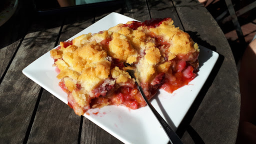 Die Kuchen sind allesamt lecker. Egal, ob die vielen Varianten von Quarkkuchen, allen voran die Bernstein-Torte. Die sollte jeder mal probiert haben. Die ganzen Fruchtigen Rhabarber, Johannisbeer, Kirsch-Sahne-Guss, Kirsch-Streusel, Sanddornschnitte und und. Oder auch die Trockenen: Schokoladen-Kuchen in mehreren Variationen, Hefe-Kuchen und Bienenstich, die eher saftig als trocken sind, und Mohnkuchen nicht zu vergessen. Das Ganze dann auch noch in mehlfreier Variante für die, die es mögen und Allergiker. Lecker sollen auch die Eierlikör-Kuchen sein, selbst kann ich die aber nicht beurteilen. Eierlikör gehört bei mir nicht auf den Kuchen. Gebacken werden die Kuchen allesamt selbst, weshalb der Kuchen nur im Café gegessen werden kann. So lecker, wie die Kuchen sind, wäre sonst gleich alles weg.