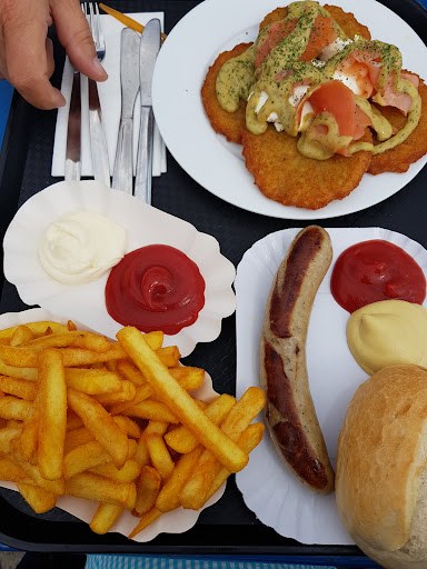 Read moreKlasse Aussichtspunkt. Die leuchtend blauen Tische laden zum Hinsetzen ein und der Blick über die Ostsee ist fantastisch. Die Bedienung ist zu uns trotz hohem Gästeaufkommen äußerst freundlich und mit den Kindern sehr geduldig bei der Bestellung gewesen. Das Essen war frisch zubereitet und sehr schön angerichtet. Meine gebackenen Fischteile waren sooooo lecker. Die Pommes natürlich auch. Es war auch reichlich und preislich angemessen. Die kleinen Pommes waren eher eine große Portion und meine Tochter bekam kostenlos noch mal Ketchup- und Majo-Tütchen dazu, als ihre aufgebraucht waren.