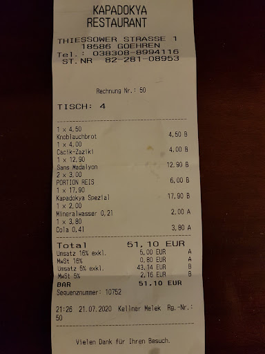Read moreDa gewesen und schon an den Tasten da wir uns so über dieses Restaurant geärgert haben. Das kleinste Problem dabei war die Stunde Wartezeit auf das Essen, wir wurden gefragt ob wir Zaziki mit Brot haben möchten was wir bejahten, den Teller gab es nach einer halben Stunde, was uns aber nicht gesagt wurde ist das diese Sachen in anderen Restaurants immer zum guten Service gehört hier extra kostet, sowie sämtliche Beilagen die eigentlich zum Essen dazu gehören. Zu denn Gerichten bekommt man keine einzige Beilage, auch wirklich gar nicht, keine Kartoffel, keine Pommes eben gar nichts, das Essen war auch eine glatte 5 minus mit drei Sternchen. Das Kapadokya war ein angebliches Stück Lamm das in einer braunen Wasser artigen "Soße" schwamm, ich habe dort drin noch ein paar kleine mini Pilze gefunden sowie ein wenig Paprika und Zwiebeln, ach ich habe ja noch etwas vergessen, es waren noch zwei ganz kleine mini Kartoffel Spalten drin und das für 17,90 Euro. Das andere Gericht sollte mit Schweinefilet sein aber man konnte die hälfte davon nicht essen weil es voller sehnen war. Wir haben denn Wirt drauf angesprochen das das wohl zu teuer war und das man uns vorher da drauf ansprechen sollte das man selbst alle Beilagen extra kosten. Der Wirt war absolut uneinsichtig und meinte es war so alles normal. Noch eine Kleinigkeit zu der Hygiene, die Tische werden nicht sauber gemacht sondern nur mit einen Lappen der für alle anderen Tische auch in einen kleinen Blech Gefäß eben nass gemacht wurde und damit wurden alle Tische abgewischt, als wir das gesehen haben hat es uns auch nicht mehr gewundert das der Tisch so geklebt hat. hat wir das vorher gewusst hätten wir das Lokal nie betreten. Mein Frau sagte beim raus gehen das sie lieber ein eingepacktes Sandwich von Lidl...