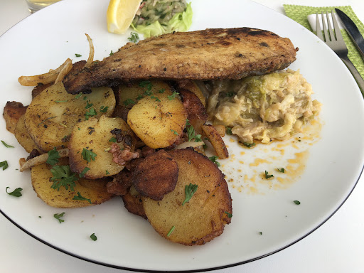 Übrigens der Kuchen war nur TK. Das haben wir auch erwartet. Das Essen an sich gut. Über die trockene Salatbeilage auf dem Schnitzel sehe ich hinweg. Das Fleisch war gut. Panade wie erwähnt auf einer Seite verbrannt. Fisch (Dorsch) war gut. Pommes und Bratkartoffeln waren prima. Muss man erwähnen. Der Kellner bräuchte mal...