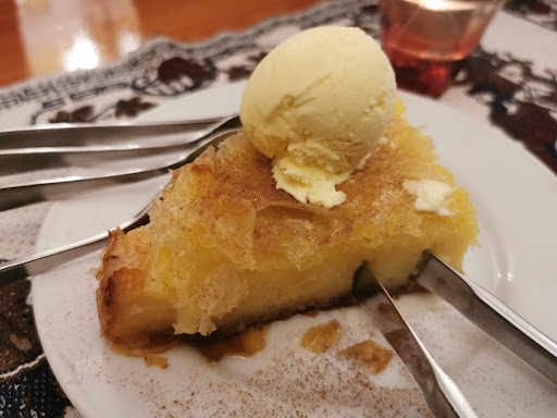 Als Hauptspeise Cyros mit Zaziki, Salat und Pommes. Cyros war mittelmäßig, nicht knusprig sondern richtig lätschig. Zaziki war ok . Salat, das selbe, kann man Ruck zuck selbst schneiden und auf den Teller werfen von 2 Meter Entfernung. Der HORROR waren die Pommes, fett triefend, innen nicht durch, kein Salz.