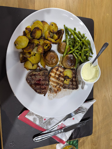 Heute waren wir nach einem Spaziergang im naheliegenden Park, kurzentschlossen im Steakhouse, um etwas zu essen. Wir haben uns im Aussenbereich einen Tisch ausgesucht. Sehr negative fiel auf, dass von den Tischen, die bereits mit Platzsets vorbereitet waren, einige verschmutzt waren, da die Blätter der Bäume auf den Tischen und den Stühlen lagen. Selbst während unserer Anwesenheit änderte sich an diesem Zustand nichts. Der gesamte Bodenbereich, inklusive des großen roten Teppichs vor der Eingangstür, waren sehr verschmutzt. Dann kam das Personal, abwechselnd ein Mann und eine Frau. Die Kellnerin versuchte wenigstens Lust an dem was sie tut zu zeigen, wenn auch nur bedingt erfolgreich. Der Kellner versuchte nicht mal motiviert zu wirken. Es gab vom Haus eine Creme mit Baguette-Scheiben. Schöner Einstieg, was das Essen anging. In der Speisekarte stehen die alkoholfreien Getränke mit einer Angabe von 0,2 Liter zu 2,10 €. Meine Cola Light wurde dann ungefragt in der 0,4 Liter-Version zu 4,20 € gebracht. Das überbackene Schnitzel mit Bratkartoffeln als Beilage war anständig und hat uns geschmeckt. Preis-Leistungs-Verhältnis fanden wir in Ordnung. Nachdem ich die Rechnung bestellt hatte, brachte mir der Kellner, in bekannter Langsamheit, einen zusammengelegten Bon. Ich legte das Geld auf den Tisch und nannte ihm den Preis inklusive Trinkgeld. Er grabschte die Scheine vom Tisch und legte wortlos das Wechselgeld hin. Es gab kein "Danke" für´s Trinkgeld oder "Aufwiedersehen, Danke für ihren Besuch". Zusammengefasst müssen wir sagen, dass das Essen zwar zufriedenstellend war, aber auch Service und Ambiente eine wichtige Rolle spielen und wir deswegen wahrscheinlich nicht mehr hingehen, da ich vergleichbares Essen auch anderswo für dieses Geld bekommen kann, ohne mich als Störenfried zu fühlen, der wahrhaftig auch noch bedient werden muss. Deswegen nur 2 Sterne. Bitte unbedingt am Service arbeiten, da sonst das Lokal nie richtig gut besucht sein wird. Es war eher leer, als wir dort waren. Wir können...