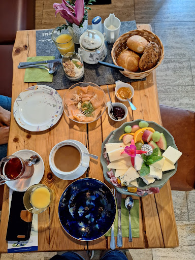 Die Parkplätze an der Straße sind kostenlos. Von der Straße gelangt man in den gemütlichen und überschaubaren Frühstücks/Kaffee-Kuchen Bereich. Im hinteren Teil des Hauses gibt es noch einen großen Raum der sich für Feste und Feiern gut eignet. Im Aussen-Bereich ist der Garten, der bei schönen Wetter zum verweilen einlädt. Zum Kaffee und Kuchen war ich schon öfters mal da, der Kaffee schmeckt gut und der Kuchen war immer lecker. Heute hab ich zum ersten Mal das Frühstück genossen. Der Kaffee war heiß und stark, so wie ich ihn mag. Das Frühstück für zwei ist völlig ausreichend und abwechslungsreich, sowie schön angerichtet. Der Inhaber seine Frau und der Sohn führten heute, den Familien Betrieb, dass freundlich, schnell und professionell. Es wurde nachgefragt ob noch weitere Wünsche offen sind oder ob noch was fehlt oder gewünscht wird.