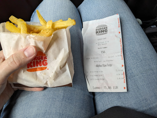 Read moreIch war am 27.07.23 dort, weil ich auf der Durchfahrt war. Das war das mit Abstand schlechteste Burger King in dem ich je war. Die Preise liegen deutlich über den normalen Burger King Preisen (über 14€ für ein kleines Menü). Zusätzlich werden Coupons nicht akzeptiert. Es war nur ein Mitarbeiter vorne an der Kasse, der die Bestellungen bearbeitete. Das hätte auch gereicht, aber leider war er unfassbar langsam. Um 11:57 Uhr hatte ich meine Bestellung am Terminal bezahlt (kleines Menü aus 1 Burger, Pommes und Getränk). Es hat insgesamt 17 Minuten (!!!) gedauert, bis er die Sachen aufs Tablett gelegt hat, obwohl kaum was los war und der Burger bereits 8 Minuten (!) in dem Wärmefach an der Ausgabe lag. Das war Systemgastronomie ohne System. Ich kann jedem wirklich nur raten, dieses Burger King zu meiden und ein paar Kilometer weiter zum nächsten...