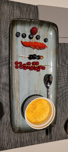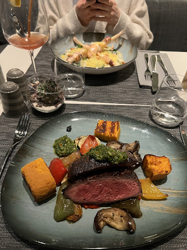 Als wir angekommen sind, standen wir erstmal vor verschlossenen Türen, reingekommen sind wir dann über den Hoteleingang. Auf Nachfrage wurde und erklärt, dass die Tür gegen 17:30 Uhr für das Restaurant geöffnet werden sollte, das heute aber wohl vergessen wurde. Mit den Jacken wurde uns dann nicht geholfen, was an sich nicht schlimm ist, bei den nächsten Gästen war dies aber der Fall. Gleiches galt auch für den Gruß der Küche, diesen haben alle um uns erhalten aber wir nicht. Als Vorspeise hatten wir die Guacamole bestellt und konnten vorher schon sehen wie diese am Nachbartisch zubereitet wird. Hier hat der Kellner erklärt das unter anderem Koriander und Paprika in die Guacamole kommen. Unser Kellner hat uns dann erklärt, dass es Kerbel und Chili sind, was wir dann auch überprüfen konnten. Als Hauptgang hatten wir dann zum einen den Lachs & Seafood Spieß auf Zitronenrisotto und zum anderen das Sirloin-Steak auf Grillgemüse mit Süßkartoffelbrot. Die Zusammenstellung und Rezepte der einzelnen Gerichte haben Witz und weisen definitiv den progressiven Stil der kalifornischen Küche auf. Allerdings gab es auch einige Punkte die noch besser abgestimmt sein könnten: Zum einen war das Zitronenrisotto von der Säure etwas zu stark und das Steak eher am blutigen Ende des Medium-Gargrades. Natürlich soll ein Zitronenrisotto auch nach Zitrone schmecken, hier wurde aber definitiv etwas mit der Zitrone übertrieben. Das Steak ist durch den Garpunkt noch sehr bissfest geblieben, was auch etwas am Hüftsteak an sich liegt. Hier würde ich mir vielleicht eher ein anderes Stück vom Rind wünschen und wäre auch bereit dafür mehr zu bezahlen. Ansonsten war aber alles gut, das Steak hatte eine gute Kruste und war trotzdem gleichmäßig gegart. Auch der Lachs und das Seafood waren genau richtig gegart und haben mit dem Curryschaum gut harmoniert. Zum Dessert hat wir dann Blutorange & Matcha, was lecker war, aber auch nicht herausragend gut.