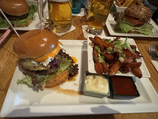 Read moreWir haben das Lokal mit drei Personen an einem Samstagabend besucht. Zuerst mal das Positive: Nette Location. Man hat von den gemütlichen Ledersofas aus einen schönen Blick über den Stadthafen Münster. Im Sommer kann man sich auf die überdachte Außenterrasse setzen. Die Getränkekarte ist umfangreich, wir hatten Bier und zwei Cocktails, die den Namen auch verdient haben. Wir hatten reserviert und kamen aufgrund schlechten Wetters etwa 20 Minuten zu früh. Trotzdem wurden wir nach kurzer Wartezeit an einen Tisch geführt. Nun das Negative: Ich fange jetzt nicht davon an, dass ein Cheeseburger ohne Beilagen nicht 15€ kosten sollte...die meisten ähnlichen "hippen" Restaurants sind da in ähnlichen Preisklassen unterwegs. Die Burger sind aber lieblos zusammen geworfen und mit viel zuviel Soße ertränkt, so dass man die Einzelteile kaum auseinanderhalten kann. Geschmacklich ist das Fleischpatty langweilig und für den Preis recht klein. Wir hatten die Burger Medium gebraten und mit drei Personen am Folgetag Magenschmerzen.... Als Beilagen hatten wir Chili-Cheese-Nuggets, die den Namen nicht verdienen. Es kam eine übersichtliche Portion, die geschmacklich mehr an Knäckebrot, als an Chili-Cheese erinnerte. Beste Supermarkt-Qualität aus der Mikrowelle. Die Nuggets schmeckten nicht so, als hätten sie jemals eine Friteuse oder eine Chili gesehen. Nach erfolgter Bestllung kamen die Burger extrem schnell. Wir hatten etwa 5 Minuten nach der Bestellung das Essen auf dem Tisch. Ob das jetzt für eine qualitativ hochwertige Küche spricht (siehe oben) muss jeder selbst beurteilen. Ansonsten war der Service mittelmäßig und uninteressiert. Fazit: Für uns...