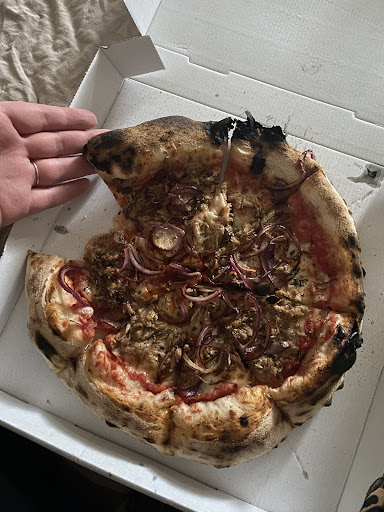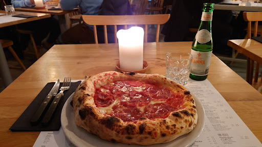 Read moreZum Essen: Wer sich mit neapolitanischen Pizzen auskennt und diese auch schon wirklich gut gegessen hat, könnte hier enttäuscht werden. Der Teig ist sehr salzig und insgesamt nicht wirklich locker, eher fest. Die Pizzen sind ziemlich klein- wie man den Bildern entnehmen kann. Zudem hat die Pizza sowohl am Rand als auch am Boden viele verbrannte Stellen, obwohl wir bei der Bestellung darum gebeten haben, dass unsere Pizzen bitte hell gebacken werden. Aioli gab es leider nicht, was grundsätzlich kein Problem darstellt. Allerdings gestaltete sich die Kommunikation recht herausfordernd, sodass einfach Olivenöl auf der Pizza landete.