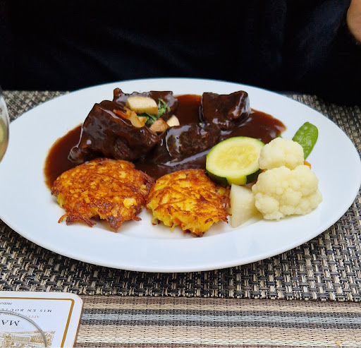 Nachdem die Vorspeisen so eine Katastrophe waren, wollten wir gehen und stornierten die Hauptgänge. Dies war nicht mehr möglich, die Hauptgänge wären schon zubereitet. Wir hatten einmal Boeuf Bourguignon (das sollte ja sowieso schon lange gegart sein) und ein Entrecote (siehe Fotos). Um Ärger zu vermeiden, denn die Chefin machte uns sehr unfreundlich klar das wir jetzt ein Problem haben, haben wir die Speisen dann mitgenommen.