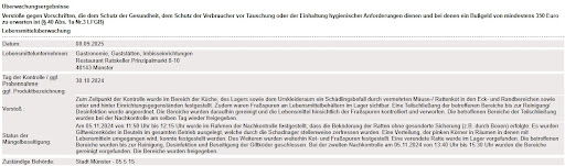 Bei einer amtlichen Kontrolle am 30. Oktober 2024, veröffentlicht am 08.09.2025, wurden jedoch erhebliche Hygienemängel festgestellt. In der Küche, im Lager und im Umkleidebereich wurden Spuren von Schädlingen festgestellt, darunter Mäuse- bzw. Rattenkot in Rand- und Eckbereichen sowie hinter und unter Einrichtungsgegenständen. Außerdem gab es Fraßspuren an Lebensmittelbehältern im Lagerraum.