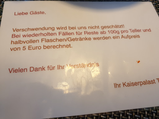 Fazit Der Kaiserpalast ist weniger ein Ort für Feinschmecker als für Hungrige, die Vielfalt und Menge schätzen. Wer gehobene Küche, Finesse und durchweg konstante Qualität erwartet, wird hier nicht glücklich. Wer jedoch mit Freunden, Familie oder Kollegen unkompliziert essen gehen will, ohne tief in die Tasche greifen zu müssen, findet hier ein solides Ziel.