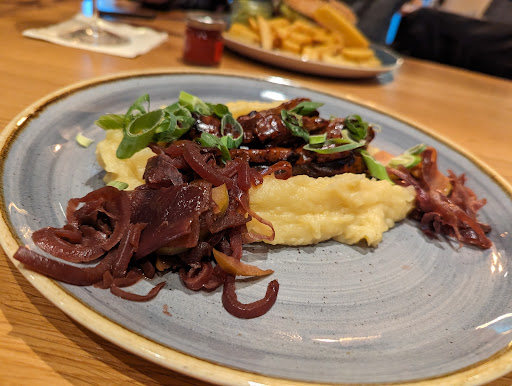 Aber auch hier wurden wir eher enttäuscht.. Der Burger sollte medium sein, der Pattie war außen kohleschwarz und komplett durch, nicht medium.. Bratkartoffeln teils schwarz.. Rinderbäckchen ebenfalls schwarz angebrannt..