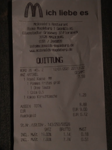 Read moreHeute dem 30.07.2021 war ich mit Freunden bei „MC‘s“. Um 20:47 habe wir unsere Bestellung am Automaten abgegeben und Bezahlt. Nach 30min war die Bestellung immer noch nicht fertig. Auch andere im Laden haben gesagt sie warten schön länger als 30min. Einfach eine Frechheit! Nach ca.40min war unsere Bestellung dann auch mal fertig. Bei unserer Blödheit haben wir den einen Milchshake fallen gelassen. Daraufhin waren meine Hände beschmiert und klebrig. Die Mitarbeiter haben Mich dumm angeguckt und haben mit ihrem langsamen Arbeitsstil weiter gearbeitet. Ich habe dann gesagt wie wäre es mal mit einem Tuch. Daraufhin sagte die eine Mitarbeiterin: ja kommt gleich ( anstatt mir einfach schnell diese sch… Tücher in die Hand zugeben ). Die Mitarbeiter sind auch nicht Deutscher Herkunft (was ja KEIN Problem ist), aber wenn die Mitarbeiter die Zahlen nichtmal ansagen bzw. richtig aussprechen können. Dann sollten Sie vielleicht mal ihre Bildschirme Reparieren lassen oder deutschsprachiges Personal verwenden. Auch müssten die Mitarbeiter besser eingearbeitet werden. Vor allem das Arbeitstempo anziehen! Ich werden diesen Laden nicht mehr besuchen! Leider kann man keine NULL-Sterne vergeben, weil dies wäre in diesem Fall echt angebracht! Meine Schlussworte sind: Einfach nur Enttäuschend! Und Geht Lieber alle zu...