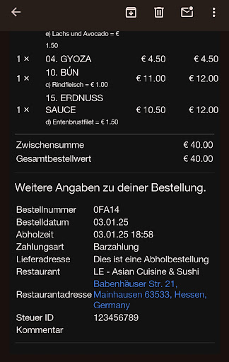 Read moreSehr leckeres Essen, sowohl die vietnamesischen Speisen als auch das Sushi. Die Bestellung war einfach online zu tätigen. Bilder konnte ich leider nicht machen, da das Essen nach dem Transport nach Hause etwas ramponiert war und es auch nicht mehr ganz so warm war. Die Damen, die mich bedient haben, waren sehr nett und haben mir alles genau erklärt. Auch auf den Sonderwunsch wurde eingegangen. Warum dann nur 4 Sterne? Das vietnamesische Essen war zwar lecker, aber die Soße war flüssig und das Gemüse bestand bei 3 Gerichten hauptsächlich aus grünen Bohnen. Mir fehlte Bambus und Sojasprossen. Dafür fand ich Auberginen. Außerdem waren mehrere Sushi Speisen zusammengepackt worden. Es war mir vor Ort und auch zu Hause nicht möglich, die Bestellung auf Vollständigkeit zu prüfen. Dafür viel mit auf, dass die Rolls, welche in Reispapier eingepackt sein sollten mit Salat eingewickelt waren. Auf den Bildern sah es anders - vor allem...