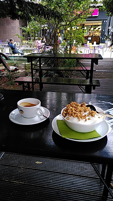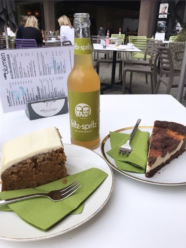 Very cozy coffee shop. I really liked the patio seating by the fountain outside but the inside has comfy chairs. They can do table service if you dine in but you can also just order and pay at the counter. It seems very popular with the hipster crowd but based on my experience it can be a welcoming place for anyone. The two baristas were both cheerful and patient with my not-good German. The menu is very vegan friendly - there are vegan options for sandwiches and baked goods, and there’s oat milk for drinks. I got a Blumenkohl panini, a Mandelkuchen, and a Chai Latte. I was a fan of the panini, the smashed cauliflower in was actually very flavourful with curry-esque spices. No complaints on the latte. The Mandelkuchen fell short of my expectations, I thought it was on the dry side, although the strong almond flavour was nice. If I had been able to see a cross section of this before I ordered, I would’ve gotten something else - the cake hadn’t been cut into yet when I ordered. The other cake slices looked better. Everything is priced reasonably - my total was about €14. It’s the kind of place I’d probably go to all the time if...