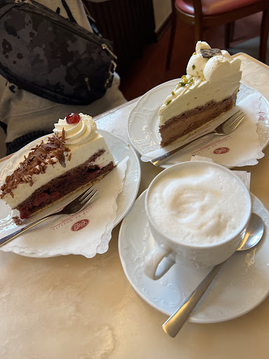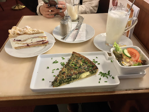 This cafe was recommended by my tour guide in Germany for its “incomparable” cakes, so I wanted to check it out. It certainly lived up to the talk; the food was just amazing. The prices may look a little steep for a cafe like this, but the quality makes it more than worth it. I had a Spinattörtchen which was easily the best spinach quiche-like thing I’ve ever eaten - besides lots of spinach, it was filled with soft Emmentaler cheese which gave it such a distinct flavour and unique gooey texture. The side salad it came with was also very good: fresh vegetables in a creamy dressing. I can’t remember exactly what the cake I got was called. It had layers of cream and pastry with berry jam, topped with a streusel crust. Although this isn’t the sort of flavour I usually go for, I liked the look of the different layers. It was difficult to eat with a fork because the pastry was a lot sturdier than the cream, but the quality of the pastry and even the purity of the simple whipped cream was really excellent. I don’t think I’ve ever had a streusel that I liked this much. The dine-in experience was a little confusing to me, since you order the cake at the counter in front, but for everything else it’s a regular table service model, with a waiter that comes to take food and drink orders and brings the bill. But I am Canadian visiting Germany for the first time so I cannot reasonably expect to understand the service models here. We had to wait a while to pay after we were finished eating because our waitress got very busy, but otherwise the service was good - it wasn’t too much of a wait for my tart and drink to be brought out, and the waitress was really nice. We were sitting outside when it suddenly started pouring, and she was ready to make a space for us inside. I wish I had more chances to visit so that I could try more cakes because they all...