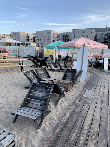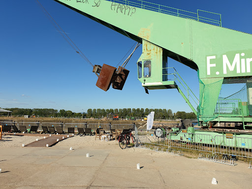 Hmmm…einerseits eine kreative Idee, Sand in großen Mengen aufzuschütten, um den überraschten Besucher so etwas wie Urlaubsfeeling zu vermitteln, allerdings verliert sich der positive Eindruck am Tresen, dort wird Essen (Oliven, Feta etc.) in vielen kleinen Plastikbechern mit Plastikdeckeln angeboten. Das ist doch fast eine Verweigerung von Nachhaltigkeit und es gibt doch bereits zeitgemäße und kreative Alternativen! Der Blick aufs Wasser ist ganz nett, man sieht Stand-Up-Paddeler und ein paar Schwäne, wenn man sich nicht am Bauzaun stört. Überhaupt ist das neue Stadtviertel, das den Flair von Büroimmobilien ausstrahlt, ein Beispiel von missratener und gescheiteter Stadtplanung. Es gibt keine Verbindung zwischen den glatten Wohnblöcken (ist da Leben drin?) und der Wasserseite - schade ! Fahrt mal nach Oslo…so hätte es auch gelingen können…dort sind die Erdgeschossflächen halböffentliche Räume mit Kneipen, Läden, Galerien mit großen Schaufenstern, die zum Flanieren einladen.