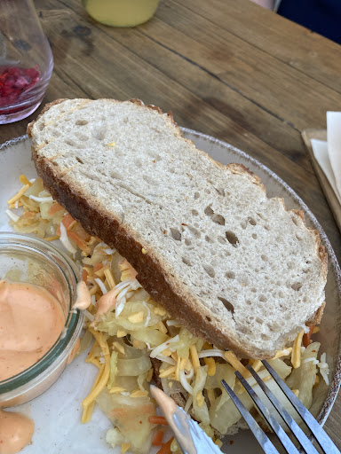Was jedoch nicht gut ist, war das Essen. Wir hatten verschiedene grilled Sandwiches, die jedoch ĂŒberhaupt nicht kross geröstet geschweige denn warm waren. Es hatte eher was von einem weichen Brot mit kaltem Belag, was schade ist. Einerseits weil es anders auf der Karte beworben wird und weil man fĂŒr zwei einfache kalte Brotscheiben zwischen 11-13⏠zahlt, das ist zu viel und kann jeder besser zuhause. Unser grilled Cheese Sandwich (Bild) war belegt mit trockenem und nicht geschmolzenem, kalten StreukĂ€se⊠Zudem wurde uns eins der Sandwiches mit den Worten âSorry, ist gerade sehr viel los!â an den Tisch gebracht. Okay, war das die Entschuldigung dafĂŒr, dass keine Zeit war das grilled Sandwich anstĂ€ndig zu grillen? Das sollte nicht der Anspruch sein, wir warten gerne etwas lĂ€nger, wenn wir dann auch das Essen anstĂ€ndig zubereitet bekommen. Der SpundekĂ€sâ mit Brezeln war vom Geschmack her okay, jedoch nicht herausragend. Leider war auch das SpundekĂ€s/Brezel VerhĂ€ltnis nicht ganz ausgeglichen so dass man recht schnell Brezeln ohne etwas zum dippen ĂŒbrig hat, weil es zu wenig SpundekĂ€s war. Den Preis von 6,90⏠finde ich absolut nicht gerechtfertigt fĂŒr die Menge die man erhĂ€lt.