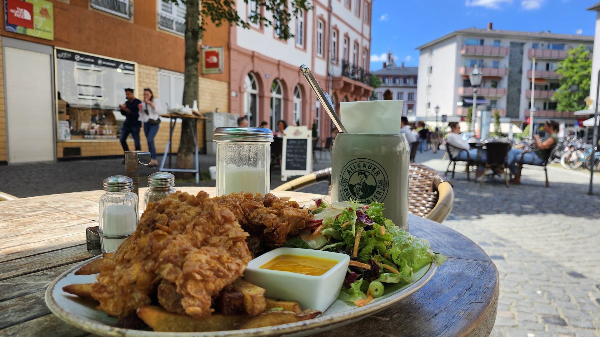 Die Einrichtung ist Spartanisch und altbacken, aber Okay. Die Kellnerin hat uns freundlich einen Platz zugewiesen, und vorher den Tisch gereinigt...das war schon mal vielversprechend. Dann bekamen wir die Speisekarte vorgelegt, und konnten in Ruhe das überschaubare Angebot Studieren. Als es ans Bestellen ging, nahm das Drama seinen Lauf, meine beiden Begleiterinnen wählten beide die Hänchenbrust im Cornflakes Mantel mit selbstgemachten Pommes, ich wollte mir ein Saftgulasch, was fest auf der Karte steht bestellen, die Antwort der Kellnerin lautete, Gulasch ist aus...um 13.15 ist das ein Armutszeugnis. So bestellte ich auch die Hähnchenbrust. Nach ungefähr 10 Minuten wurde das Essen Serviert. Zum Essen kann ich nur sagen, es war eine Katastrophe, Die Pommes waren ungenießbar, sie waren fettig, matschig und schmeckten einfach ekelhaft...ich würde sagen wie altes Fett mit einem noch fieseren Beigeschmack. Die Hähnchenbrust war gut Paniert, aber leider hatte sie auch einen nicht Akzeptablen ekeligen Beigeschmack, der Salat wird mit auf dem Teller serviert, sodass das Dressing sich mit den matschigen Pommes vermischt. Als ich von jedem einen Bissen gegessen hatte, fragte die Kellnerin uns, ob alles in Ordnung sei, ich verneinte dieses, und sagte das es ungenießbar sei, darauf bot mir die Kellnerin ein anderes Essen oder einen Espresso als Entschädigung an. Ich wollte weder das Eine noch das Andere, denn wer noch nicht mal Pommes machen kann, der kann auch nichts anderes Kochen. Meine Begleiterinnen haben einen Teil des Essens mit murren verspeist, und die Pommes zum größten Teil ausgelassen. Dann ging es ans bezahlen, und es wurde uns der volle Preis 62,10€ für 3 Gerichte mit Getränken berechnet...in meinen Augen eine Unverschämtheit. Nach kurzem Geplänkel am Tisch, meinte meine Frau, das sie jetzt weniger bezahlt hätte, doch dem war nicht so. Als sie es bemerkte, ging sie zur Theke, und brachte ihre Einwände noch mal vor, diese wurden aber Harsch abgelehnt, da man ja jeden Tag das Fett wechseln würde und überhaupt hätte die Chefin die Pommes probiert, und die würden gut schmecken. Den weiteren Wortlaut möchte ich jetzt nicht wiedergeben. Mein Fazit: Eine einzige große Katastrophe, wer das Essen als wohlschmeckend bezeichnet, sollte weder Kochen, noch Gäste bedienen. In der kleinsten und schäbigsten Frittenbude, ist mir sowas noch nicht auf den...
