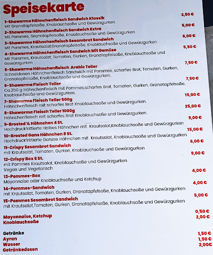 Solides Shawarma zu einem super Preis. Für den kleinen Hunger zwischendurch gibt's Shawarma Sandwich für 2,50 €. Ansonsten haben sie aber auch ein paar Tellergerichte mit Gemüse, Pommes etc. im Angebot.