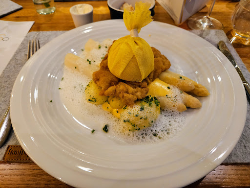 Steins Traube in Mainz: A Culinary Experience to Savor Located in the outskirts of Mainz, Steins Traube is a restaurant that offers an exceptional dining experience. I had the pleasure of trying the Menu Prestige, which consisted of seven delectable dishes. The Amuse-Gueule, consisting of Gebackener Curry-Garnelencroustillant im Kataifiteig, was a perfect starter that set the tone for the evening. The crispy texture of the kataifi dough was balanced by the soft and succulent shrimp filling, infused with aromatic curry flavors. This was beautifully paired with a glass of champagne that further accentuated the flavors and the textures of the dish. Moving on to the second course, the Gateau von Elsässer Gänseleber, eingelegter Perigordtrüffel | Birne | Piemonteser Haselnuss | Brioche, showcased a combination of rich and earthy flavors that delighted the palate. The foie gras was silky and decadent, complemented by the sweetness of the pear and the crunch of the hazelnuts. However I found that the taste of the perigord truffle was a bit weak and lacked a bit of intensity. The icewine from 1984 was a perfect match for the dish, with its complex layers of sweetness and acidity. The third course, the Lauwarmer Kohlrabisalat, Zitrusmarinade | gebeizter Lachs | Imperialkaviar | Haferjoghurt | Dillöl, was a standout dish that impressed with its perfect balance of acidity and flavor. The citrus marinade added a tangy note to the dish, while the succulent salmon was perfectly complemented by the pearly caviar and the creamy haferjoghurt. The Riesling from Nierenstein was a great pairing, with its crisp and refreshing acidity that cut through the rich flavors of the dish. The fourth course, Jakobsmuschel in langem Pfeffer gebraten, Lila Spitzkohl | Rote Beete | Pistazie | Rohmilch Crème fraîche, was a highlight of the evening. The perfectly cooked scallop was juicy and succulent, enhanced by the bold flavors of the long pepper. The creamy crème fraîche added a richness to the dish, while the pistachios and vegetables added a crunch and a pop of color. The Sauvignon Blanc blend, specially crafted for the restaurant, was a great pairing that complemented the flavors of the dish. The fifth course, Bretonischer Knurrhahn, Krustentier-Safran-Sud | Bottarga | Artischocke | eingelegte Tomate | Calamaretti | Schwarzkümmel, was another standout dish that combined a variety of flavors and textures to great effect. The gurnard was perfectly cooked and paired well with the calamaretti, while the crustacean and saffron broth added a depth of flavor that elevated the dish. The restaurant's rose was a great match, with its light and refreshing character that complemented the seafood flavors. The sixth course, Variation vom Holsteiner Salzwiesenlamm, Rücken mit Pommery-Senfkruste, Gepökelte Lammzunge | gebackenes Lammbries | Zwiebelcreme | Speckbohne | Kartoffeltaler, was a high-quality dish that showcased the quality of the ingredients. The lamb was cooked to perfection and the Pommery-Senfkruste added a nice crunch and a touch of acidity. While the dish was high in quality, it lacked a bit of intensity in flavor. A more pronounced taste of the Zwiebelcreme would have elevated the dish to perfection. The dish was paired with a rich and full-bodied red wine, a Spätburgunder. The meal concluded with a dessert of Babybanane in Salzkaramellglasur with gebrannte Mandel, Limette, Kokos, Sorbet von Litschi, and getrocknete Ananas. The combination of the sweet banana and the tangy lime was a burst of flavor in the mouth, while the coconut added a tropical twist. The staff was outstanding, professional, and welcoming, making the dining experience all the more enjoyable. I would highly recommend Steins Traube to anyone who appreciates German wines, especially those from the region, and to anyone who enjoys fine dining with high-quality ingredients. It was a truly...