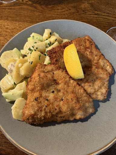 Read moreWe were so lucky to get a table! We didn’t have a reservation and were offered a 1 hour time limit which was totally fine. The atmosphere is so cozy with shared tables and lit candles and beautiful decor. We ordered a Riesling dry wine which was really good and I had the Weiner schnitzel with a potato cucumber salad that was excellent! My husband had the Frankfurter schnitzel with green sauce. Both meals were very delicious! Service was great! We appreciated getting in and was one of my best schnitzels of our 1 month trip! I loved the potato cucumber salad! A great alternative to fried potatoes! Reservations would be best as it is a...