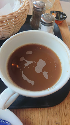 Nicht zu empfehlen. Die Backwaren sind zwar okay, aber für industriebackwaren zu teuer. Ein paar Türen weiter gibt's echte Bäckereiwaren die besser schmecken für weniger Geld. Das Frühstück ist enttäuschend. Statt bestelltem Rührei gab es ein lauwarmes Omelett. Kommentar des Personals: Das ist ein Rührei, sieht bei uns immer so aus. (kurz danach wurde einem anderen Gast ein Rührei serviert.. Aber den kannte das Personal offenbar persönlich und der bekommt eben Sonderbehandlung...) Der "schwarze Kaffee" den ich bestellt habe, war ein wässriger Kaffee mit Milchresten, woher die auch immer kamen. (s. Bild) Kommentar: Anders können wir das nicht. Kurz: Zu teuer für die erhaltene Leistung, und Lust auf Kundenservice hat auch niemand, außer man kennt die Verkäuferinnen persönlich. Dann gibt's Sachen, die man für andere ZAHLENDE Kunden nicht bereit ist zu...