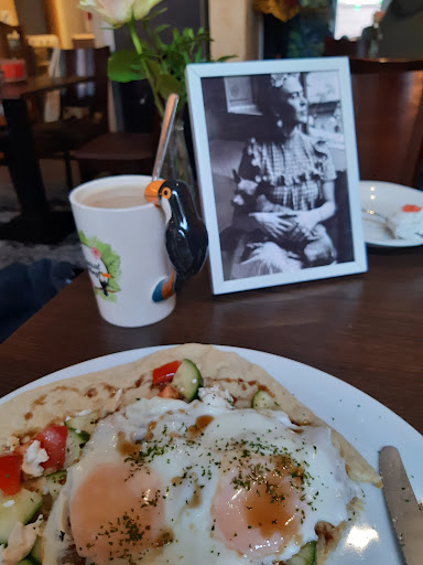 Read moreWe went for breakfast, it was just around the corner from where we were staying. The café certainly has its very own charm. My mother-in-law enjoyed listening to the Beatles music playing, my husband was excited for his morning coffee, my toddler loved loved loved the gentle senior dog Amon. Luckily Amon enjoyed being pet by her. I loved how everyone was so happy to be there 😆 Breakfast 'only' had two options, unfortunately none of them were vegan as they had butter, cheese, eggs and honey as components. Delicious though. I loved the bread and appreciated seeds on the plates. Generous portions, very friendly staff. Would come back 100%, but at a different time because it looked like they have some cool vegan choices during lunch/...
