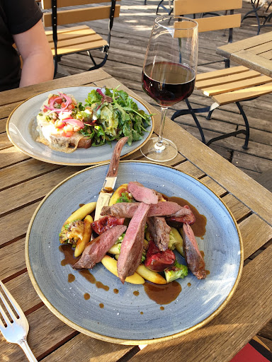 Read moreDas Restaurant befindet sich im 5. Stock des Musikpark Gebäudes und bietet auf seiner Dachterrasse einen netten Ausblick, inkl. Sonnenuntergang, auf einen Teil des Mannheimer Hafens am Neckar. Der Blick ist "Industrie-chic" hat aber durchaus seinen Charme, außerdem ist quasi immer etwas los. Alle paar Minuten fährt ein Zug vom oder zum Bahnhof vorbei, Containerkräne bewegen sich und Möwen und gar Störche kreuzen den Blick.