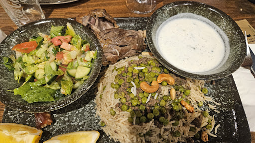 Read moreI would probably rate them 4.5 for my overall experience. This was our third visit at this place now and we somehow liked it Everytime we have been here.We ordered there biryani (which we call pulav as it's not the traditional Indian/Pakistani biryani ) but trust me the rice was really tasty it came along with grilled chicken and some fosuliya. The best part was the huge bread which came along the falafel salad. It was so fresh and big that u end up getting the tummy full. Lastly we ordered there Arabic style ice cream which was new to us and we liked it some how similar to there "halwa aljibibi" a bit expensive (6.90) but was a good experience. There are a few points to be considered before visiting the place: Expect a delay in getting placed especially if you are visiting without reservation or on weekends. You are going to get the deserts with delay. Portions size are big as far as the salats are concerned. Completely Arabic ambience with loud music. Now the good part is the food is really nice slightly on the expensive side as compared to the similar restaurants in the nearby places but they are definitely...