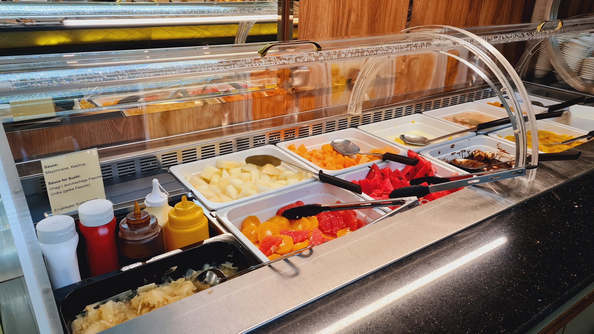 Das Buffet befindet sich im normalen Preissegment. An einem ganz normalen samstagmittag läuft man mit zwei Getränken und Buffet bei etwa 40 € raus. Die Bedienung ist aufmerksam und schnell, wenn man Sonderwünsche hat. Da ich immer Buffet esse kann ich nicht sagen wie lange es dauert wenn man von der Karte bestellt. Oder ob es so eine überhaupt gibt 😂