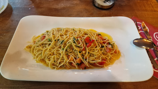 Read moreIch war mit meiner Freundin dort, da sie das Lokal aus der Vergangenheit gut in Erinnerung hatte. Schon die Begrüßung war wenig freundlich, als wir dann einen Platz gefunden hatten, bediente uns eine nette junge Dame. Die Getränke kamen schnell und wir bestellten Spaghetti Frutti di mare und eine Pizza Calzone. Hier fing das Desaster an. Zwar kamen die Speisen in einer angemessenen Zeit, waren jedoch alles andere als essbar. Die Calzone meiner Freundin bestand aus Formschinken, Formsalami (wo wir uns beide sicher waren, dass keine Salami auf der Speisekarte steht) und triefenden Pilzen. So ergoss sich beim anschneiden der Calzone so viel gräulicher Saft aus der Calzone, dass fast der ganze Tellerboden bedeckt war. So ließen wir die Pizza zurückgehen. Meine Nudel mit Frutti di Mare waren leider auch ungeniesbar. Die Nudeln selbst waren von der Kochzeit in Ordnung, die Frutti di Mare rochen übermäig nach Fisch (und ich esse Frutti di Mare oft und gerne), waren faktisch ungewürzt und bereitreten mir schon während der Essens eine leichte Übelkeit. Als dann die reklamierte Calzone wieder bei meiner Frendin ankam, war das Ergebniss auch nicht besser als der erste Versuch. Wieder schwamm alles und es schmeckte stark pappig. Der etwas schmierig wirkende Kellner brachte die Calzone, machte einen abfälligen Kommentar und suchte Körperkontakt zu meiner Freundin und mir. Ausrede warum das Essen nicht gut sei: Neuer Lieferant.