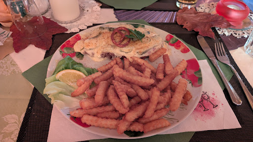 Haben Schnitzel bestellt. Ich hatte das Spreewälder Schnitzel mit Gewürzgurken, Schinken und käse überbacken. Dazu Pommes.