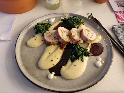 Menu is tiny, which means the cooks can focus on quality and presentation. 5 stars! All in all we had bread to dip in olive oil with sea salt (heavenly!), tomato soup, spinach in "Blätterteig", Sekt, red wine, and desserts. The cinnamon bun and vanilla sauce were tasty, but unusually non-sweet and the white chocolate in the other dessert had little flavor having also no sweetness, and feeling as if it had been pulverized and sprinkled on the toffee. It melted in your mouth, but had little flavor. It was a little too experimental for us. They raspberry sorbet was perfect.