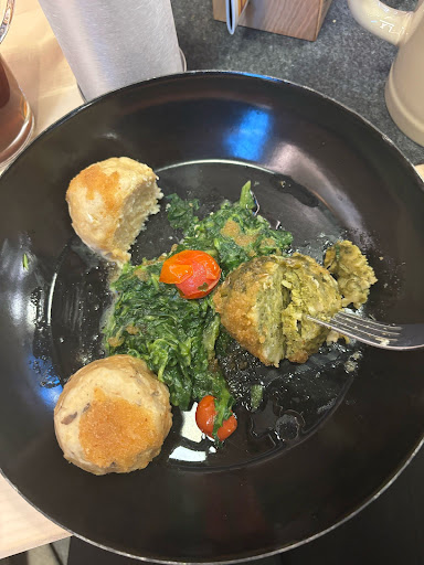 Das Knödeltrio ist ein Witz für 18,50 bekommt man drei kleine Knödel trocken ohne Butter ohne Sauce mit einem Klecks Spinat.