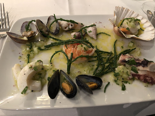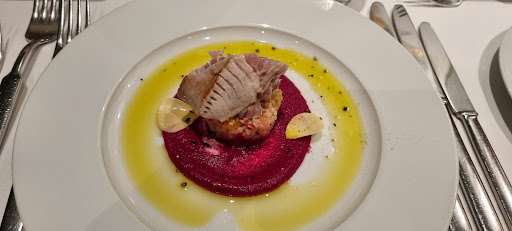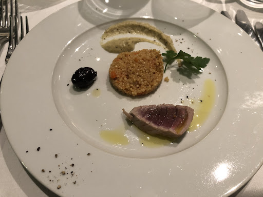 Read moreSchön ist das Restaurant nicht. Man hat versucht das Beste draus zu machen. Der Service aufmerksam. Wir hatten einen offenen Wein der sehr gut war. Das Bier aus der Flasche schmeckte uns nicht so gut. Die Vorspeisen (carpaccio vom Thun mit Fenchelsalat und gegrilltes Gemüse mit Büffelmozzarella) schmeckten nach nichts und ersoffen in Olivenöl......welches wenigstens gesund ist. Es fehlten Gewürze und Säure. Die Pasta war gut. Im Hauptgang das Lammcarree war hervorragend gegart und die Sauce ein Traum. Ebenso die Desserts. Insgesamt überteuert auch wenn die Qualität der Zutalten...