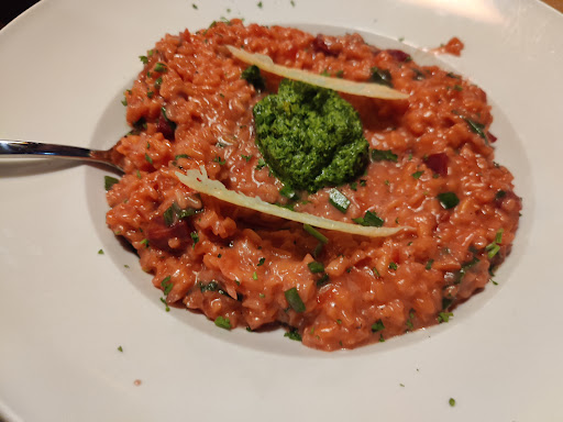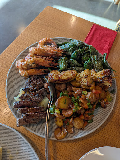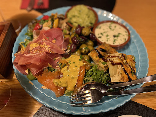 Read moreWir waren zu viert da und bestellten eine Tapas Platte für 4 Personen. Reichlich vorhanden waren die Gambas, Piementos, Chorizzo, Salami, Gemüse und Aioli. Obwohl wir 4 Personen waren wurde nur ein Persischer Spies aus Hähnchenfilet, ca. 80g, serviert. Nach zweimaliger Nachfrage kam ein zweiter Spies. Ebenso kam nur eine kleingeschnitte Merguez Wurst mit Sauce. Ein kleines Stück Rumpsteak (ca. 120g) Chimichurri lag auch dabei für 4 Personen. Und 3 Stückchen Tortilla wurden gereicht. Das Steak war von einer Sehne durchzogen auf der man rumkauen musste. Ach ja, angeblich gebeizter Lachs lag auf der Platte, es handelte sich um Räucherlachs der billigsten Sorte aus dem Supermarkt, bei dem man noch nicht einmal das verfärbte, dunkle Mittelteil, welches tranig schmeckt, entfernt hat. Dazu hatten wir 6 Gläser Primitivo, ne Cola, ein Mineralwasser und 2 Espresso ohne Plätzchen. Geschmacklich war der Spies und die Aioli sehr gut, der Rest durchschnittlich. Der Service war präsent, aufmerksam und sehr freundlich. Gekostet hat das Ganze etwa160 €, pro Person also 40 €, was wir als überteuert bewerten. Das Restaurant genügt nicht dem eigenen gesetzten Anspruch. Auf einen weiteren Besuch...