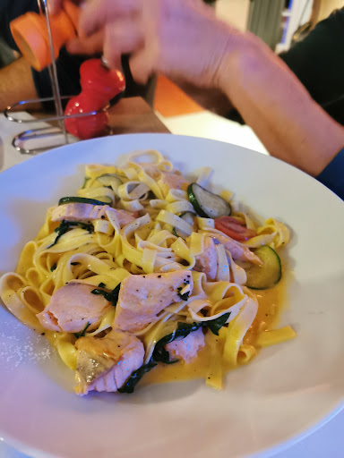 waren zu viert gegen 19 Uhr hier. Die männliche Bedienung nahm die Bestellung der Getränke entgegen, die auch schnell serviert wurden. Der Wein, ein Primitivo, hatte Aromen nach dunklen Beeren und Kirsch, war vollmundig, es fehlten etwas die Tanine. Vorspeisen 2 × Vitello Tonato, einmal Carpaccio vom Rind und einmal gem. Gemüse. Hauptgang: Tortelini gefüllt mit Ricotta und Spinat an Tomatensahnesoße, Gemischte Fischplatte mit Pulpo Lachs Calamari Gambi Gemüse und Süßkartoffeln, Cordon Bleu mit Zucchini und Kartoffeln, Gegrillte Calamari. Nach 15 Minuten kam die Frage ob es in Ordnung ist? Ja wir hatten ja noch kein Essen. Nach weiteren 30 Minuten kam die erste Vorspeise einmal Vitello. 5 Minuten später kam das Carpaccio. Nach weiteren 10 Minuten das zweite Vitello und nach weiteren 5 Minuten die letzte Vorspeise. Es vergingen weitere 45 Minuten und es kamen die Tortellini, 5 Minuten darauf das Cordon bleu und nach weiteren 5 Minuten die Fischplatte. Auf Nachfrage kam der zugehörige gemischte Salat. Auf die Calamari haben wir vergebens gewartet. Bedient wurden wir von der mittlerweile dritten Hilfskraft und teilweise vom Chef. Der Service ist unterirdisch, denn man will ja gemeinsam essen und nicht in Etappen. Die Qualität: Das Carpaccio war gut mariniert und der klein geschnittene Stangensellerie, Champignons und weitere Zutaten ergaben geschmacklich ein rundes Bild, sehr gut. Vitello Tonnato die erste Portion, das Kalbsfleisch zu weit gegart und dadurch nicht mehr so saftig und zart, die Soße geschmacklich gut. Das zweite Vitello war besser, das Kalbsfleisch auf den Punkt zartrosa. Die Tortellini, der Teig etwas zu dick, die Füllung schlecht gewürzt und zu wenig Spinat, die Tomatensahnesoße etwas zu süß, durchschnittlich. Das Cordonbleu mit schöner gewellter Panade, geschmacklich gut, ebenso die Beilagen, die beigefügten Kartoffelpuffer waren nicht knusprig und mit einen Joghurtdressing bestrichen, was die Puffer aufweichte. Die Fischplatte, reichlich, der Lachs gut angebraten, der Calamari und die Pulpoarme waren weich und schmackhaft, die Gambi waren auf den Punkt gegart, die angerösteten Zwiebeln waren schwarz angebrannt. Resumee: Wegen des schlechten Services, einmal und auch das letzte Mal, leider. An den Speisen...