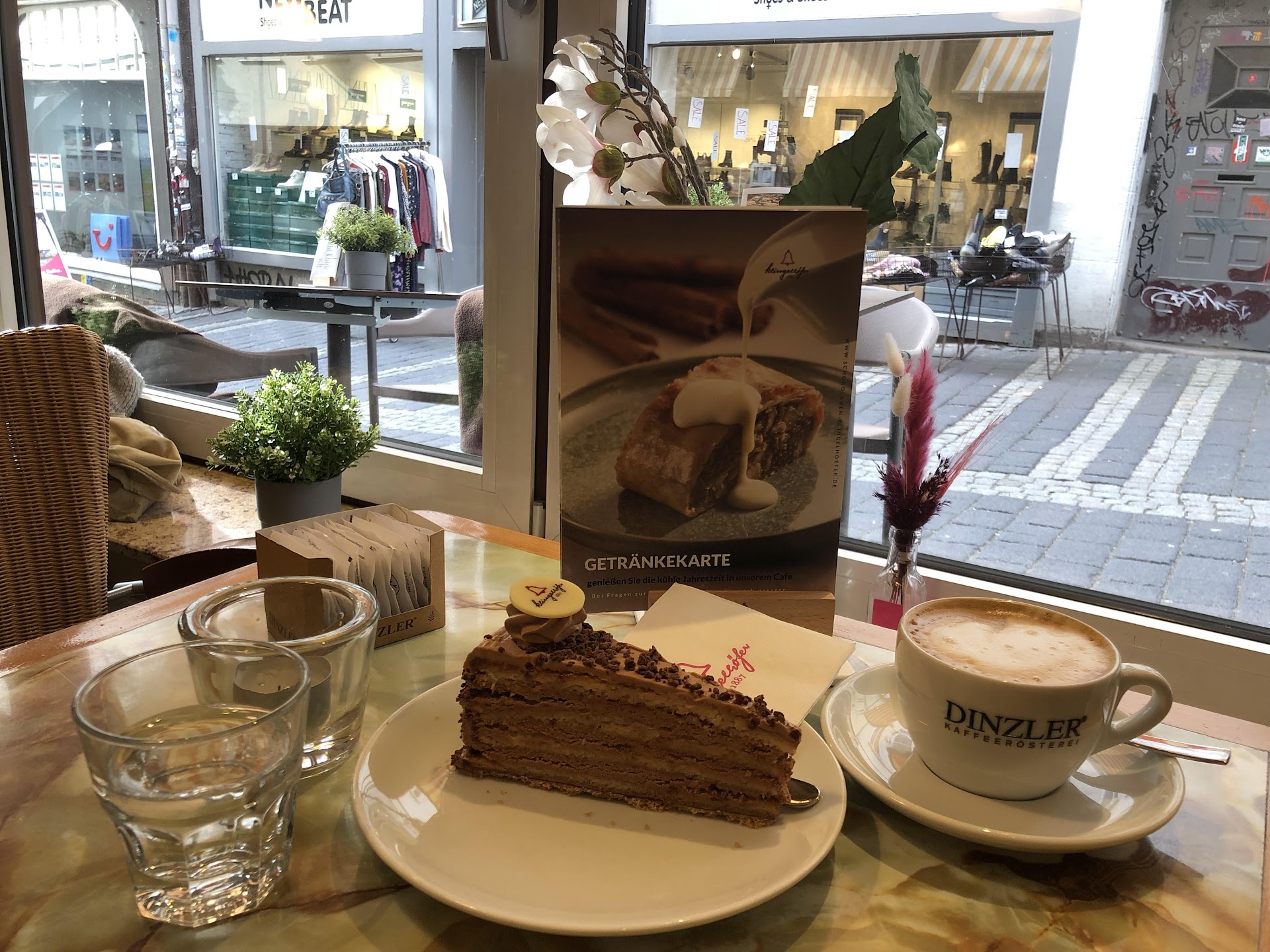 Folgende leckere Speisen bekommt man dort: Es gibt jeden Morgen Frühstück (es sei denn, sie haben Ruhetag) und davon kann man unterschiedliche Varianten bestellen. Da gibt es beispielsweise ein Frühstück "Amsterdam", ein Frühstück "Florenz" oder eines "New York" oder eines "Stockholm". Es gibt auch ein "Marburger Verwöhnfrühstück" oder eines "Landgraf Philipp". Man kann sich auch ein Frühstück komplett selbst zusammen stellen. Ich finde, das ist ein großes und tolles Angebot! Das Café bietet verschiedene Sorten Kaffee an und alle sollen frisch gemahlen sein - sie lassen bei einer Rösterei in Oberbayern den Kaffee rösten. Es werden auch Tees und viele Sorten Heiße Schokolade angeboten. Saft kann man direkt gepresst bekommen. Es gibt auch Cola und Limonade. Es werden auch warme, herzhafte Speisen angeboten wie Quiche, Suppen, Toast, Kartoffelpuffer und eine Ofenkartoffel. An alkoholischen Getränken gibt es Bier und Wein. Die tollen Torten, Tartes und Törtchen des Cafés müssen vorne an der Verkaufstheke ausgewählt werden. Man bekommt dann einen Zettel, wo die Nummer des Bestellten vermerkt ist und sucht sich seinen Platz im Café. Eine Bedienung kommt dann an den Tisch, diese holt sich den Zettel und bringt anschließend das Bestellte an den Platz. Ein intelligentes System. Die Bedienungen sind aufmerksam, sympathisch und sehr freundlich.