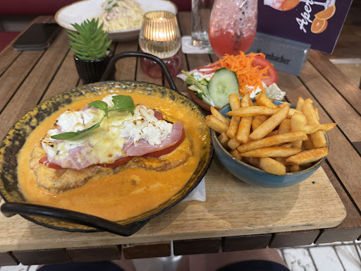 Der Kellner war überfordert und musste zwischen getränkemischen, Kunden kontrollieren und bedienen sowie der Küche hin und her springen. Für etwa 3 Minuten war ein zweiter Kellner zur Unterstützung da, jedoch auch sofort wieder auf nimmer Wiedersehen verschwunden. Die Küche war wohl auch unterbesetzt, da wir später beim Verlassen des Lokals nur eine Person in der Küche gesehen haben. Als endlich das essen kam, fehlte die Hälfte und war zu dem auch nur lauwarm. Als ich dann den Kellner darauf ansprach, hat er versucht das Problem schnell zu beheben. Zu meinem Gericht kam dann endlich das Baguette, welches wohl an der Oberseite verbrannt war und schnell abgeschnitten wurde. Mein Mann bekam seinen Beilagensalat, welcher ein Hauch von Nichts glich. Ich erwarte bei einem Beilagensalat nicht eine riesen Portion, aber den Tellerboden sollte er schon bedecken. Dazu kam, das die Scheibe Tomate beim Salat gefroren war. Trotz der Nachfrage fehlte bis zum Schluss die Pommes bei meinem Mann. Auch an den Nachbartischen könnten wir Probleme feststellen. So wurden Tische nicht abgeräumt, Besteck fehlte, kassieren dauerte sehr lange und essen stand ewig am Eingangsbereich herum (die Küche ist gegenüber, auf der anderen Seite der Passage und einer der Lieferanten war so nett und hat es dem Kellner zumindest Mal in den Gastraum herüber getragen), bis das Gericht endlich den richtigen Gast gefunden hat.