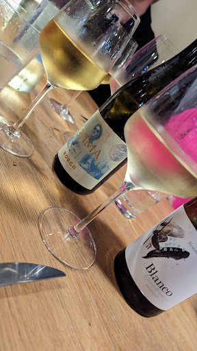 Read moreEin gemütliches, kleiner Laden mit viel Charme und ebenso charmantem und nettem Personal. Eine Karte gibt es nicht. Die verfügbaren Gerichte finden sich auf einer Kreidetafel und werden netterweise erklärt. Unsere Hauptgerichte waren sehr schmackhaft (Das Hasenragout hätte jedoch gerne länger garen dürfen, da es teilweise, noch sehr bissfest war), auch der Vorspeisenteller ist zu empfehlen. Jetzt kommen leider noch zwei kleine Kritikpunkte. Wenn ich einen Weinhandel betreibe und der Wein auch im Restaurant im Fokus stehen soll, dann muss das Personal sich hier auskennen und nicht nur jedem Tisch den Hauswein anbieten (zu dem es auch keine Details kennt) . Bei Ablehnen des Hausweins, wurde dieser uns zunächst trotzdem eingeschränkt zum Testen, bevor es dann tatsächlich einen anderen Wein gab. Generell waren die Rotweine einige Grad zu warm (wie der Gastraum eben), wodurch die Weine stets etwas stechend alkoholisch wirkten. Insgesamt aber ein toller Laden. Spitzenklasse wird er, wenn man beginnt auch abends ...