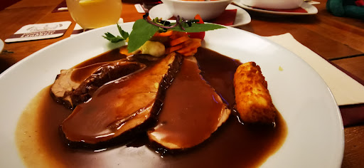 Das Essen war aber qualitativ hochwertig und schmackhaft. Ich mag zwar eher dünn geklopfte Schnitzel lieber, das ist aber wohl Geschmackssache. Und die Portionen waren insgesamt eher kleiner. Z.B. konnte der 7jährige seine Erwachsenenportion Schnitzel und Pommes problemlos aufessen. Meine Partnerin nach Braten und Klößen war noch sehr hungrig. Mein 'Fränkisches Schnitzel' und das 'geräucherte Forellenfilet' für meine Tochter (isst wie ein Spatz) waren allerdings eben...