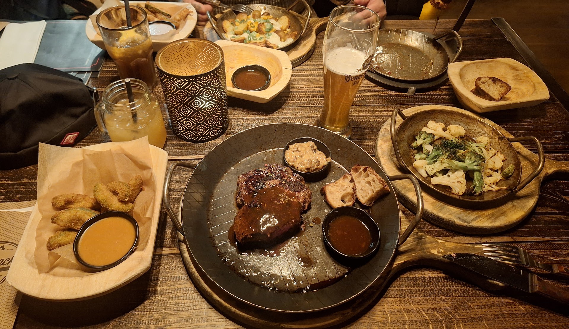 Read moreVorab, das Restaurant und das Essen sind super und ich werde deshalb auch noch mal wieder kommen. Ich kann leider nur 3 Sterne vergeben weil ein paar Dinge echt nicht gut waren/gar nicht gehen. Ich hatte einen Tisch reserviert für 4 Leute. Als wir rein kamen und ich gesagt habe das ich reserviert habe, hat uns ein Mitarbeiter zum Tisch geführt ohne groß was zu sagen. An dem Tisch standen 2 Stühle und er war echt klein und die Lage nicht gut. Dann war der Mitarbeiter auch schon weg und hat uns da stehen lassen mit einer echt unfreundlichen Art. Muss ich mir als Gast meine Stühle selber organisieren oder esse ich demnächst im Stehen ? Geht garnicht!!! Wir haben uns dann Stühle woanders weg genommen. Eine Kellnerin habe ich angesprochen ob ein anderer Tisch zu haben sei.Auf Nachfrage kam sie wieder und zeigte auf den gleichen Tisch der ein paar Meter weg stand. Der war auch zu klein und mitten drin. Bei vorab Reservierung hatte ich als Wunsch angegeben, dass der Tisch wenn möglich ein wenig abseits ist und nicht mittendrin, jedoch wie man sieht ohne Erfolg. Dann nochmal um einen anderen Tisch gebeten und als Antwort bekam ich, dass alles reserviert sei,worauf hin ich sagte das ich ebenfalls reserviert habe. Ich musste mich dann zum 3ten mal beschweren weil wir alle unzufrieden mit dem Tisch waren und dann ging es und wir haben einen guten Tisch gekommen mit Sitzbank,größerem Tisch und etwas abgelegener. Die Art und Weise wie wir bei unserem ersten Besuch behandelt wurden, erinnert mich an ein Fastfood Restaurant mit Franchisecharakter. Das trübt sehr die schöne Location und das gute Essen. So nun am neuen Tisch: Das Besteck was am Tisch vorhanden war, war teilweise unvollständig und es hing an einem Messer noch große Essensreste dran weil nicht richtig gespült. Na lecker... Kellner war nett und freundlich und hat unsere Bestellung aufgenommen. Das Essen kam echt schnell, leider von meinem bestellten Salat keine Spur. Mein Filet Mignon (was leider nicht so warm ankam, wie ich es gerne gehabt hätte) war bereits halb verputzt und dann hab ich beim Kellner den vergessenen Salat abbestellt. Als Dessert brauch ich den dann auch nicht. Getränke kamen bei uns auch recht zügig. Das FiletMignon war super und den anderen hat es auch echt gut geschmeckt. Die dünnen 6mm Pommes kann ich leider garnicht empfehlen für über 5€. Preis bei der Menge ist echt unverschämt. Die anderen Essenspreise sind aber durchaus Ok. Ich werde aufjedebfall noch mal wieder kommen und Timberjacks eine zweite Chance geben. Das Konzept und das Essen ist eigentlich genau meins. Wäre schön wenn man als Kunde demnächst besser behandelt wird und auf wichtige Dinge wie vollständige Bestellungen,sauberes und komplettes Besteck und Kundenfreundlichkeit mehr...