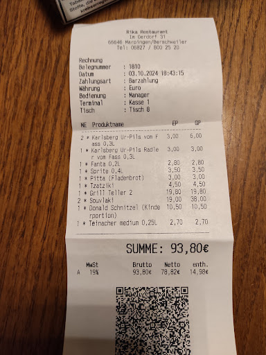 Fazit: Ich kann und würde es nicht weiter empfehlen Die Preise viel zu überteuert 19.00 Euro für 2 kleine Spieße suvlaki und 19.80 Euro für ein Grillteller ist viel zu übertrieben ( auser das Essen wäre eine absolute Geschmacks Explosion dann wäre es gerechtfertigt) Als wir erwähnt haben das das essen kalt war wurde dies nur ignoriert Voll Katastrophe noch nie so...