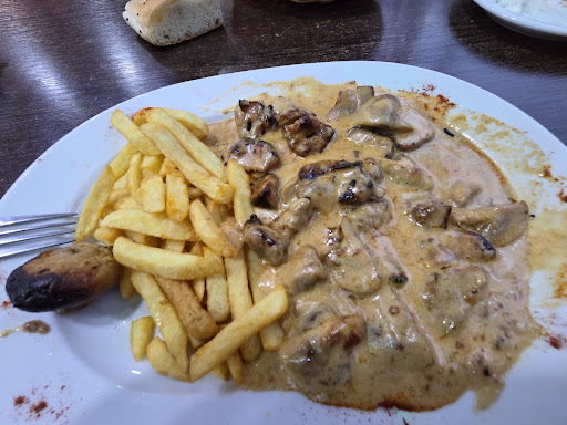 Read moreWie man auf dem Bild sehen kann, hatte ich Fleisch und Champignons in Rahmsauce mit Pommes. Meine Begleitung hatte Lammspieß in Tomatensauce mit gerösteten Brotstücken und Joghurt-Sauce.