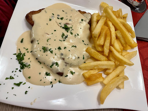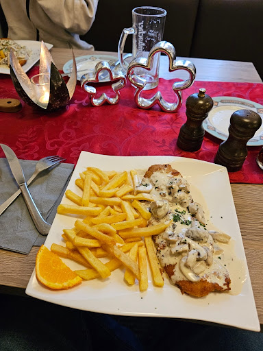 Read moreEs war sehr viel los, die Bedienung war gestresst daher hat es deutlich länger gedauert bis wir überhaupt bestellen konnten. Als endlich das Essen kam wunderten wir uns über das Stück Melone das auf jedem Teller lag, teilweise dann schon in die Soße des Schnitzels gerutscht war...das ist meiner Meinung nach einer merkwürdige "Beilage" für ein Hauptgericht dieser Art. Das Essen an sich war ok, die Soße war super aber das Fleisch war leider von nicht allzu guter Qualität. Eigentlich wollten wir einen Nachtisch essen, da aber alles so lange gedauert hatte und auch keine Servicekraft mehr kam wurde es uns dann zu spät. Wir saßen in der Nähe der Bar und mussten leider ständig hören wie der Chef sich lauthals über diverse Dinge aufregte, was eher...